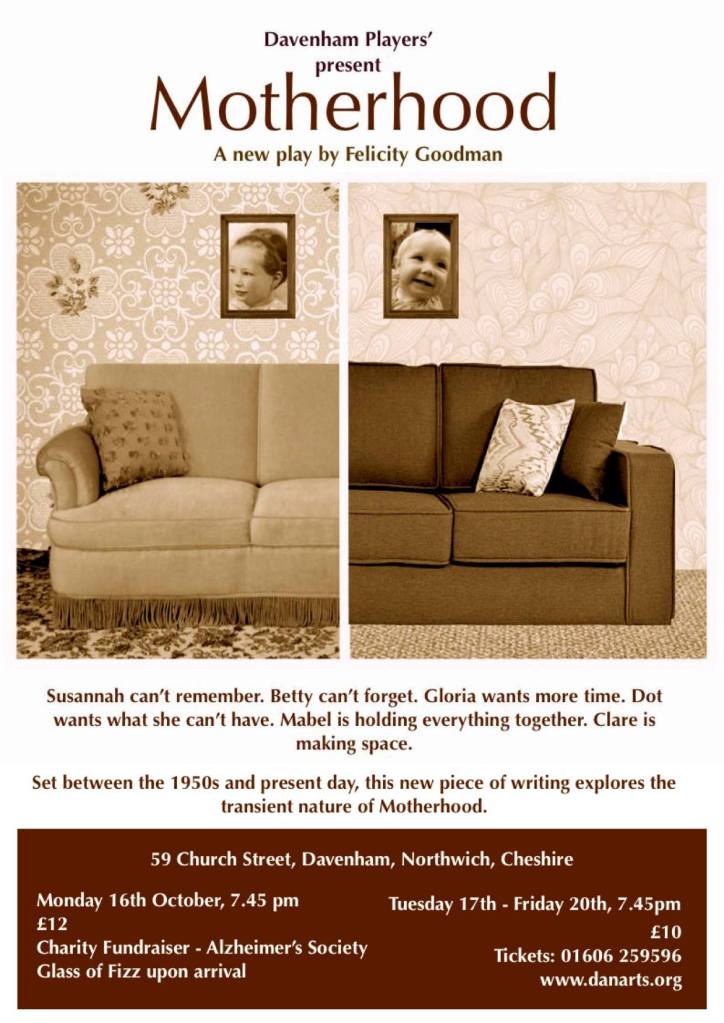 Motherhood started life as a series of creative writing workshops with Davenham Theatre. From the stories shared at this workshop, I wrote Motherhood a full length play that explores caring, mothers, dementia, maternal mental health, the role of women and how it has changed.